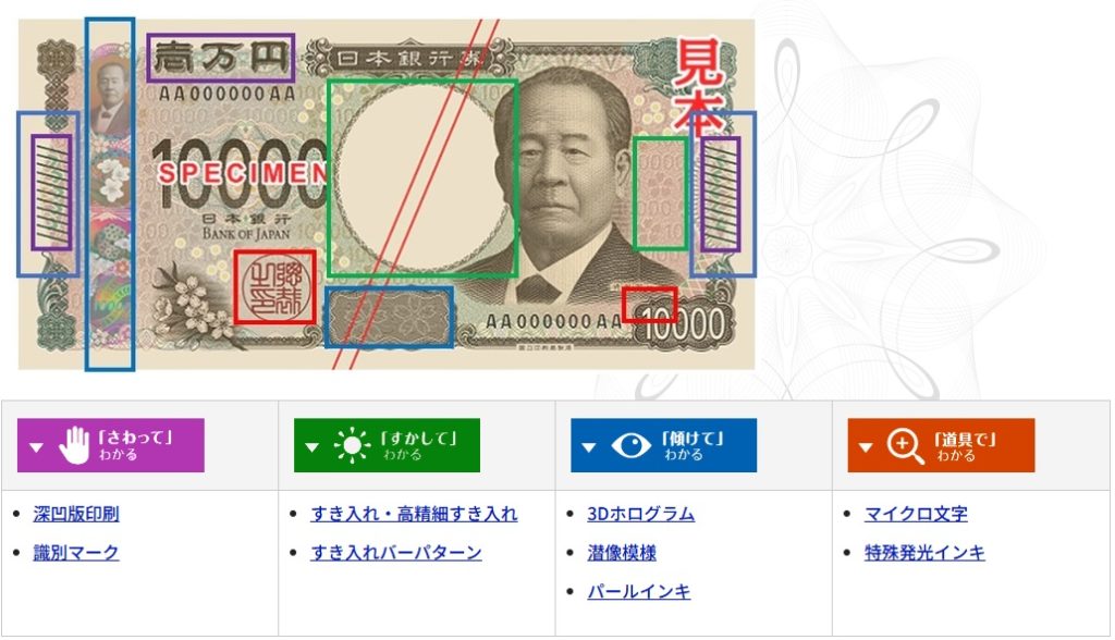 (これまでに発行された一万円紙幣は全部で4種類存在する)