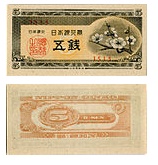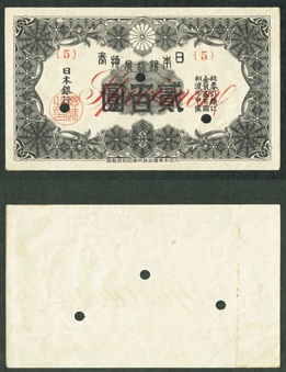 太平洋戦争中には金属が不足し、硬貨を小さくしたり、劣悪な材質の硬貨を製造したりしていたが、その後十銭紙幣とともに小額な額面の紙幣が発行された。裏面の簡素さや記番号の省略など粗悪な作りになっている。桐のちらし透かしがあるが、確認は困難。