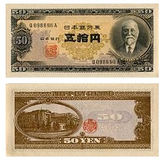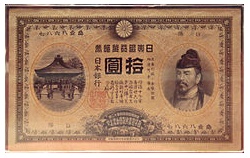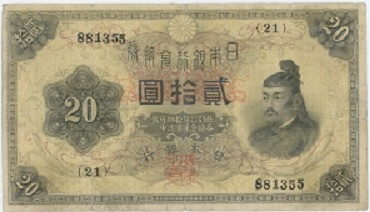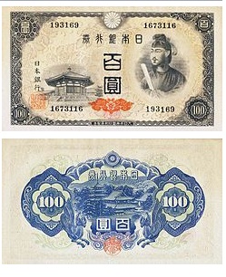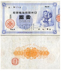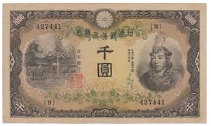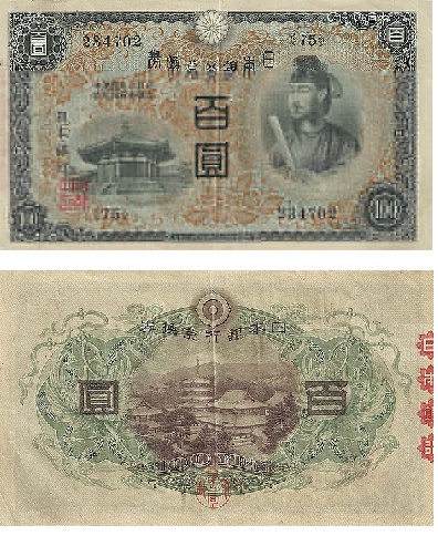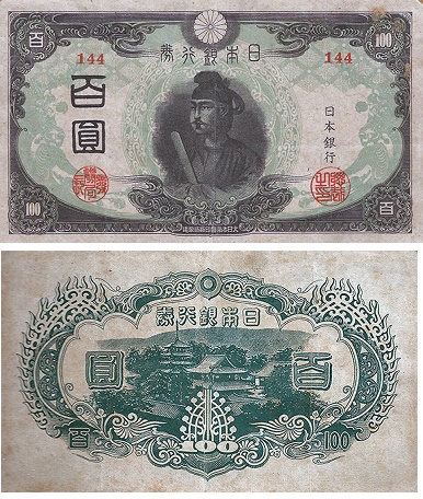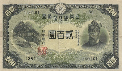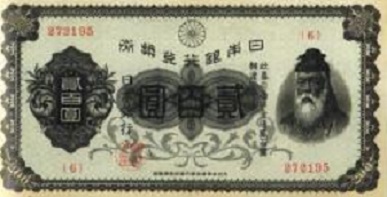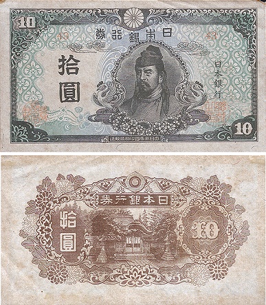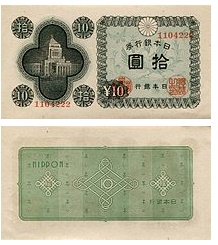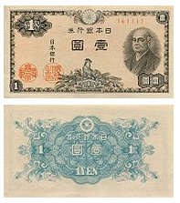 時代は第二次世界大戦に突入し、あらゆるものが戦争に駆り出され紙幣もコスト削減から粗悪な作りになっていった。1944年からは記番号が省略された。通称は「中央武内1円」である。