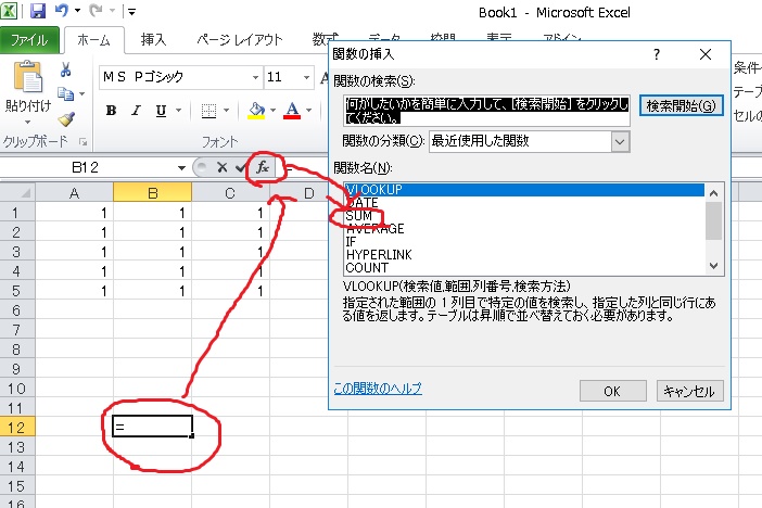 持って行き、クリック→ fx → 指示を選ぶ(まずは合計のsum)