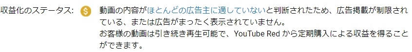 動画の内容がほとんどの広告主に適していないと判断されたため、広告掲載が制限されている、または広告が全く表示されていません