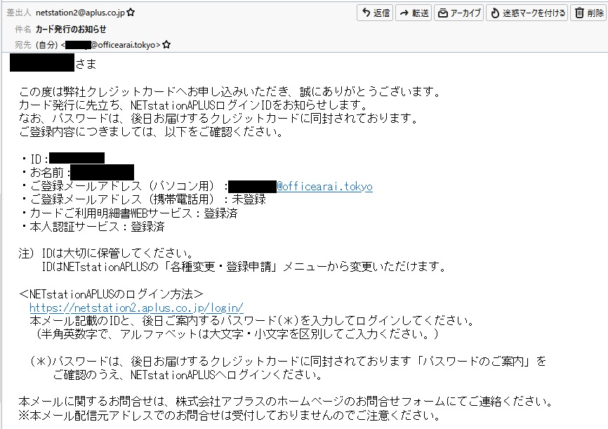 カード発行に先立ち、NETstationAPLUSログインIDをお知らせします。